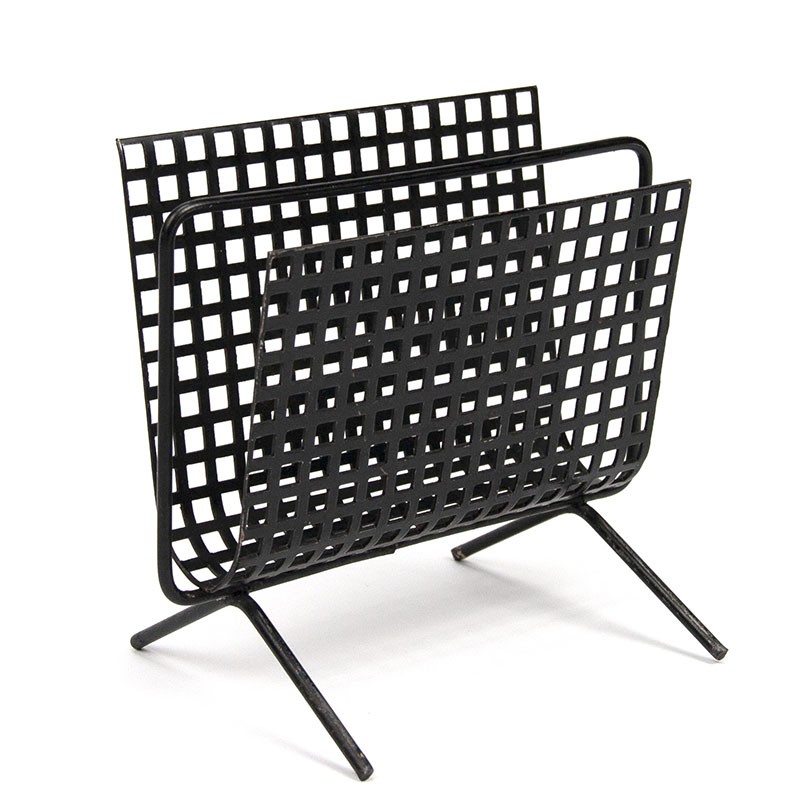 Vintage letter holder from the fifties. Black perforated metal. The condition is good considering the age, see details. The dimensions are 13 cm wide, 12 cm high and 5.5 cm deep.