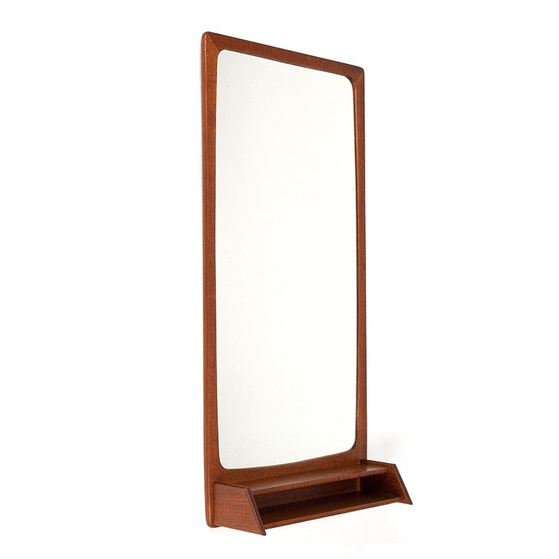 Danish mirror from the sixties. Beautiful vintage model with an open compartment at the bottom. The edge and compartment are made of teak. The condition is good, only minimal traces of use (some small spots on the top), see details. The dimensions are 39 cm wide, 12.5 cm deep and 78 cm high.
