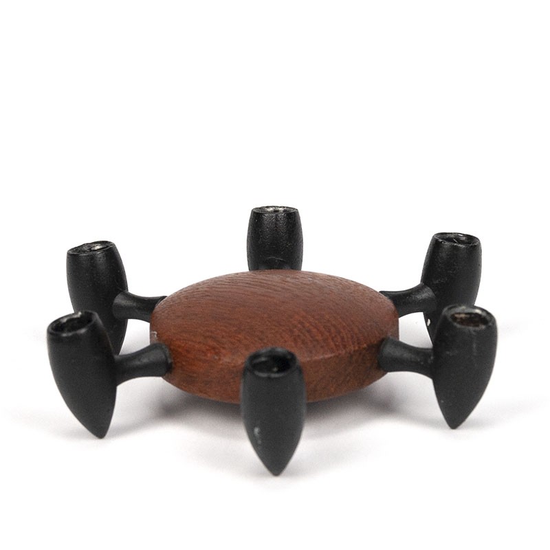 Small model Danish candlestick of the brand Digsmed (marked). Stylish design, made of teak and cast iron. The candlestick is only suitable for very narrow candles and is more intended as an object. The condition is good, see details. The diameter is 10 cm.