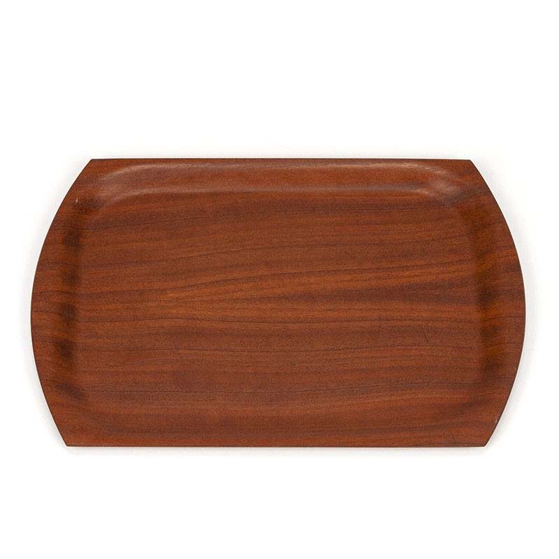 Serving tray from the sixties. Made of bent teak wood. Beautiful vintage model from Denmark. The condition is good, minimal traces of use, see details. The dimensions are 32.5 cm long and 22.5 cm wide.
