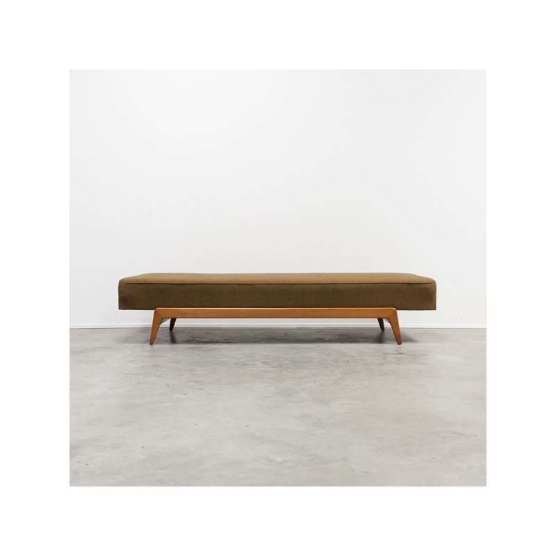Sofa / daybed from the fifties/ sixties on a wooden base. The upholstery is original and is in a quite good condition (at an angle slightly damaged). The overall condition is good considering the age, see the detail photos. The size is 190 cm L