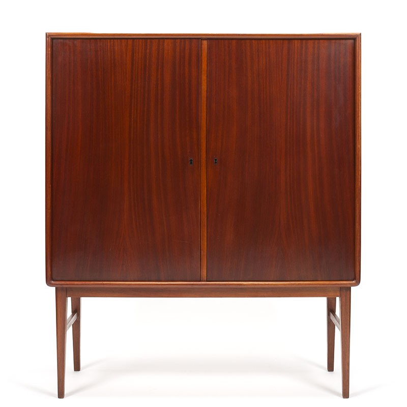 Mid-Century Danish design cabinet from the period 1960-1969, made in teak. Special model with 2 doors with different shelves behind them (not adjustable in height). The dimension of the cabinet is not common. The condition is fairly good, on the right side the wood is somewhat discolored / stained, see details (price has been adjusted). The dimensions are 110 cm wide, 41.5 cm deep and 128.5 cm high.