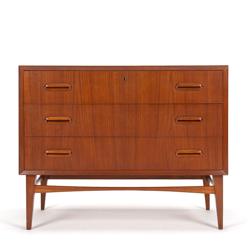 Teak chest of drawers with 3 spacious drawers from Denmark, period 1960-1965. The vintage chest of drawers has a particularly slender, open base. The condition is good, only very minimal traces of use, see details. The dimensions are 85 cm wide, 43 cm deep and 68.5 cm high.
