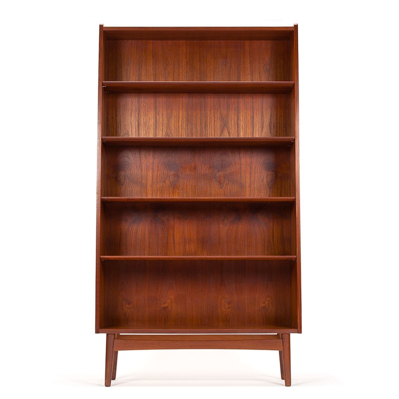 Design bookcase from the mid-sixties. The vintage bookcase is a design by Johannes Sorth for Nexø, Bronholms Mobelfabrik Denmark. A nice detail in the design is the tapered side, the top of the cabinet is 21 cm deep and the bottom is 28 cm. The shelves are adjustable in height (some discolouration visible). The condition is good considering the age, but there are some deeper scratches visible on 2 shelves, see details. The dimensions are 100.5 cm wide, 21-28 cm deep and 182 cm high.