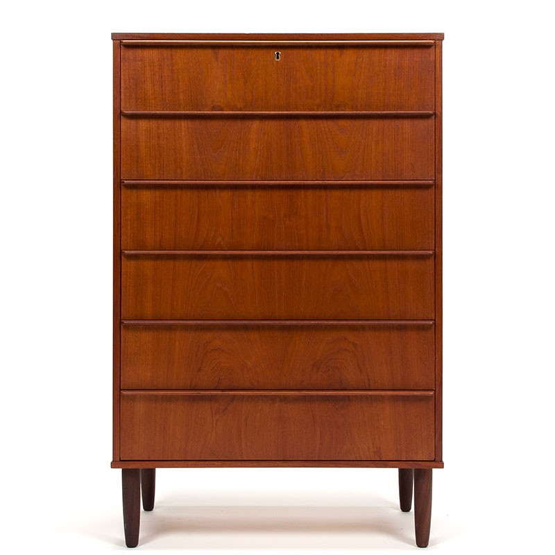 High model vintage Danish chest of drawers from the sixties. The cabinet has 6 spacious drawers with a beautiful continuous wood flame at the front. At 121.5 cm, the chest of drawers can be called a tall boy/high model. The condition is good, only minimal signs of use, see details. The dimensions are 77.5 cm wide, 40 cm deep and 121.5 cm high.