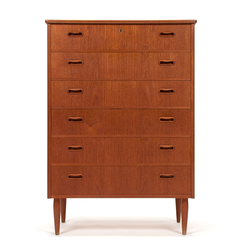 Danish chest of drawers with 6 drawers. The Mid-Century chest is from the sixties and is made of teak. A nice detail are the specially designed legs. The condition is good, only minimal signs of use, see details. The dimensions are 75 cm wide, 41 cm deep and 107 cm high.