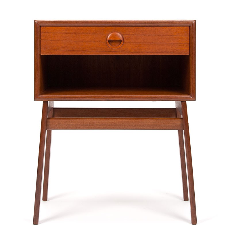 Small model Danish cabinet with drawer and/or bedside table. From the mid-sixties. Beautiful, high-quality model, made of teak wood. The condition is good, very minimal signs of use, see details. The dimensions are 45.3 cm wide, 30 cm deep and 58 cm high.