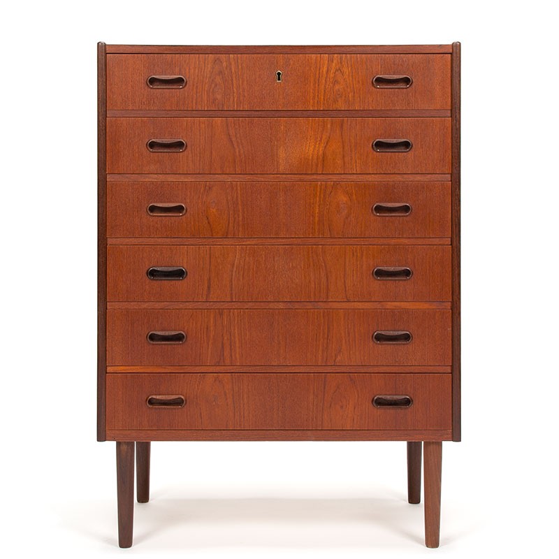 Chest of drawers with 6 drawers. Beautiful Danish vintage cabinet from the mid-sixties. The handles are half recessed in the cupboard and have a slightly darker color which contrasts nicely. The condition is good considering the age, see details. The dimensions are 70 cm wide, 39 cm deep and 100 cm high.