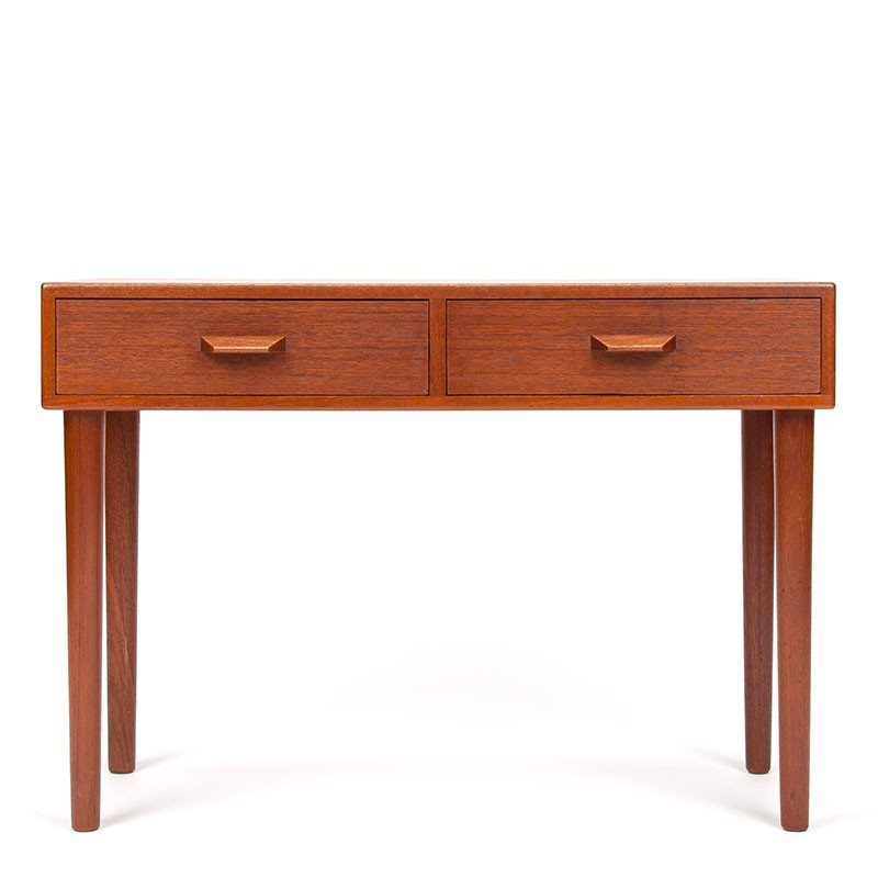Small model Danish Mid-Century design cabinet from the sixties. Beautifully designed cabinet, with 2 small drawers, on high slender legs. The condition is good, minimal traces of use, see details. The dimensions are 65.5 cm wide, 28 cm deep and 46.5 cm high.