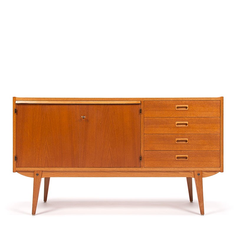 Swedish vintage sideboard, short model, from the period 1960-1969. The sideboard is made of teak. On the left 2 doors with a shelf, on the right four drawers. The cabinet stands on slanted legs. A nice detail is the extendable top. Marked with a label plate Rottne Möbel. The condition is good considering the age, light traces of use no circles, see details. The dimensions are 130 cm long, 40.5 cm deep and 75 cm high.