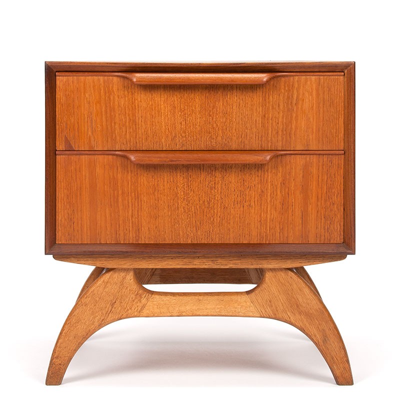 Small model cabinet from Denmark, period 1960-1969. The vintage cabinet stands on a specially designed base in oak. The whole has 2 drawers and is beautifully finished with a solid edge. A triangle is visible in the top drawer that is slightly darker. The condition is good, no water rings, see details. The dimensions are 47 cm wide, 34 cm deep and 50.5 cm high.