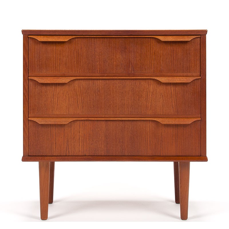 Small chest of drawers from the 1960s. Designed by Klaus Okholm and marked with the Danish Furniture Control logo (quality mark). This vintage chest of drawers is made of teak. It is in good condition, see details. The dimensions are 60 cm wide, 31 cm deep, and 64 cm high.