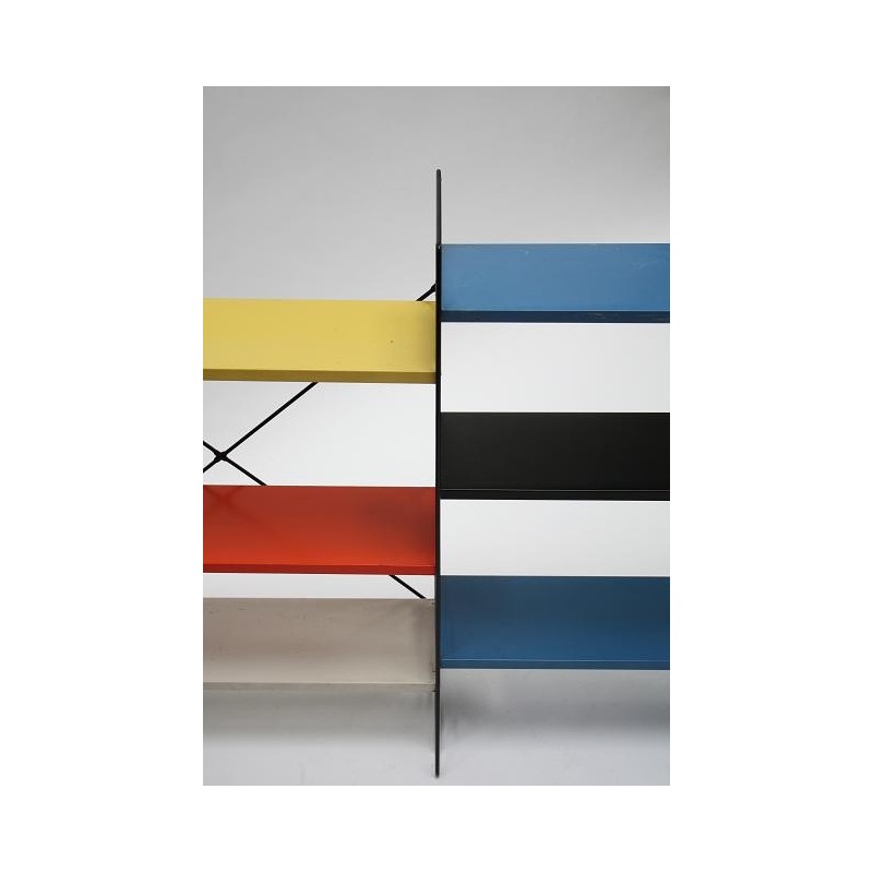 Rare standing Dutch Tomado system from the designer A. Dekker. The standing system is designed in the early 1950's. The colorful shelves give the system a beautiful and typical look for the periode 1950-1960. The system is in a good condition given it's age, but there are traces of aging ( see detailed pictures). The dimension is 195 cm long and 84,5 cm high.