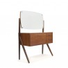Danish vintage dressing table from the mid sixties. The dressing table has a large tiltable mirror, a small drop down cabinet and two small drawers with shapely handles. The condition is fairly good, the teak border around the mirror has slight veneer damage. The dimensions are 78.5 cm W / D 39,5 cm, height 60 cm mirror is exclusive and inclusive of 110 cm.