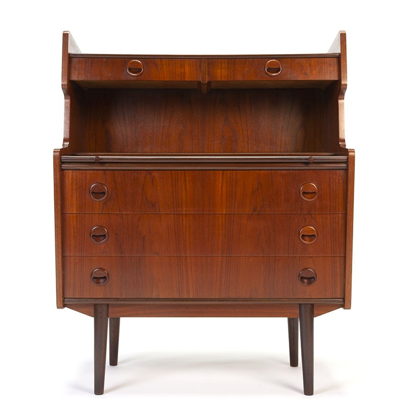 Vintage desk furniture/ secretaire from the late fifties, early sixties. Stylish Danish design, finished in a dark shade of teak. Multiple drawers and an extendable worktop at a height of 73 cm. The condition is good considering the age, some light traces of use (small stain, scratch here and there), see details. The dimensions are 89 cm wide, 45 mc deep and 113 cm high.