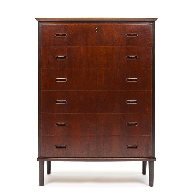 Danish teak vintage chest of drawers from the sixties. Nicely executed in a dark shade of teak. A special detail is the slightly rounded front. The condition is good considering the age, only minimal traces of use, see details. The dimensions are 80 cm wide, 43.5 cm deep and 111.5 cm high.