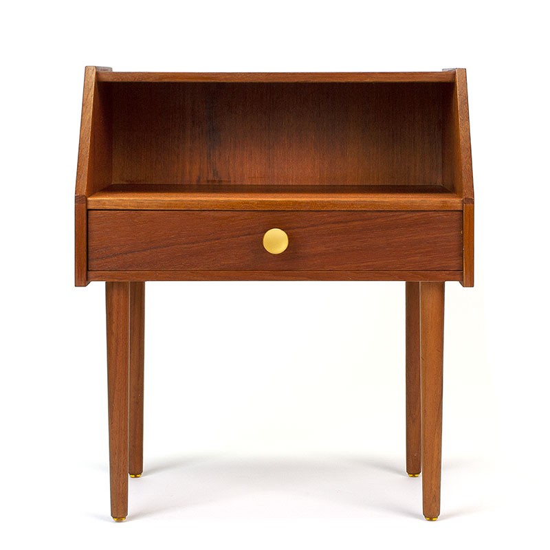 Danish vintage cabinet on high narrow legs with small drawer and open compartment. The cabinet is from the sixties. The condition is good considering the age, only minimal traces of use, see details. The dimensions are 45.2 cm wide, 53 cm high and 32 cm deep.