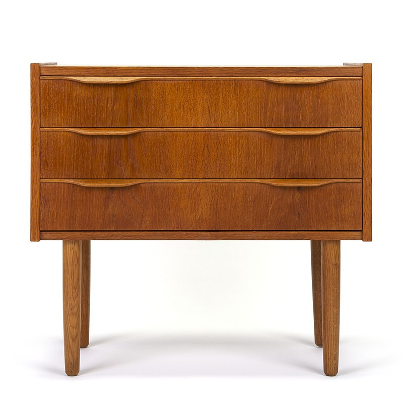Danish vintage chest of drawers with 3 drawers from the sixties. Small organic handles. Beautiful light shade of teak. The condition is good considering the age, minimal traces of use, see details. The dimensions are 60 cm wide, 30 cm deep and 65 cm high.