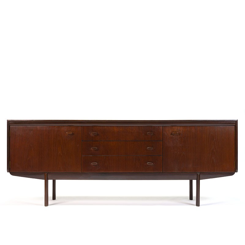 English vintage design sideboard from the sixties by White & Newton. Beautiful symmetrically designed sideboard in dark teak with three drawers in the middle. The condition is fairly good considering the age, some wear is visible around the handles (the wood has become slightly lighter there), see details. The dimensions are 193 cm wide, 43.5 cm deep and 73 cm high.