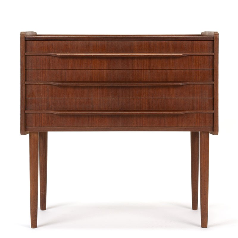Danish small model chest of drawers with 3 drawers. The vintage cabinet is made in a warm shade of teak. The drawers have a beautifully designed handle. The condition is fairly good, there are some small restorations on the edges here and there (price has been adjusted accordingly), see details. The dimensions are 60.5 cm wide, 30 cm deep and 62 cm high.
