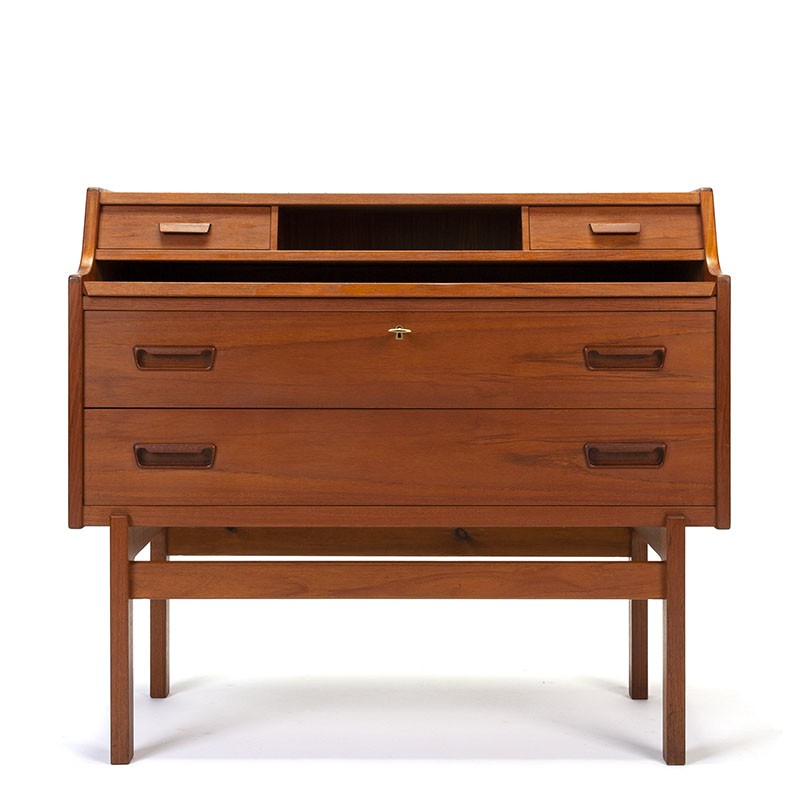 Danish secretary designed by Arne Wahl Iversen and made in the Vinde Møbelfabrik in the late sixties. High quality furniture and marked on the back. The vintage secretary is made of teak and has an extendable worktop. The condition is good considering the age, some light scratches are visible on the top, see details. The dimensions are 95.5 cm wide, 42.5 cm deep and 83.5 cm high, the worktop is extendable to a height of 69.5 cm.