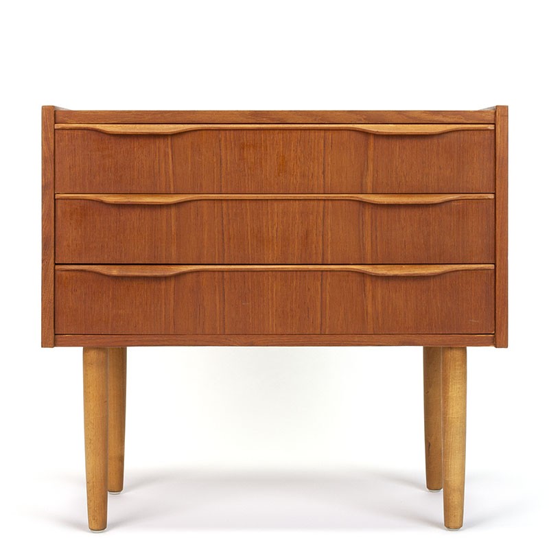 Vintage chest of drawers from the sixties. Beautifully designed organic handles. The Danish cabinet stands on oak legs (original). The condition is good, very minimal signs of use, see details. The dimensions are 60 cm wide, 29.5 cm deep and 56.5 cm high.