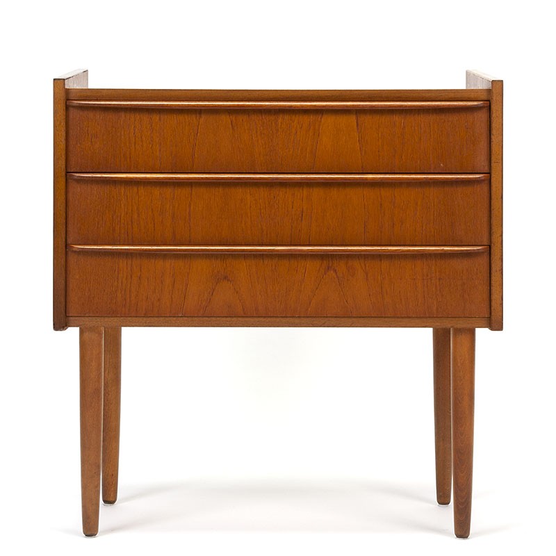Danish chest of drawers, small model, from the sixties. Made of teak on beautiful high slender legs. The handles run the entire length of the drawers. A nice detail is the raised edge on both sides of the cabinet. The condition is good considering the age, minimal traces of use, see details. The dimensions are 62.5 cm wide, 29 cm deep and 68 cm high.