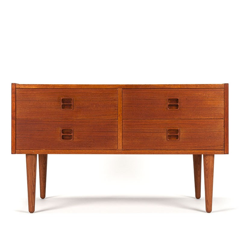Low model chest of drawers from the sixties. The chest of drawers has 4 drawers and is a design by Erik Brouer. The condition is good considering the age, only minor signs of wear, see details. The dimensions are 88 cm wide, 42.5 cm deep and 53.5 cm high.