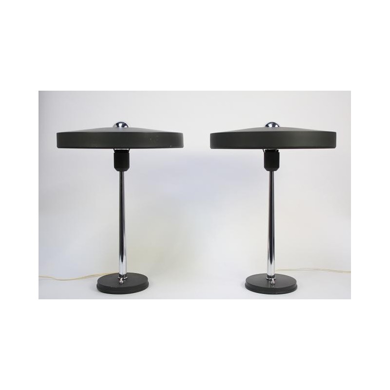 Beautiful set of 2 table / desk lamps from the Dutch brand Philips. The lamps were designed by Louis Kalff. The lamps are identical gray in color and are in a good state (here and there is a very small spot visible, see detailed pictures). The size is 50 cm high and 40 cm in diameter.