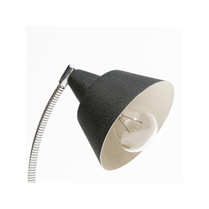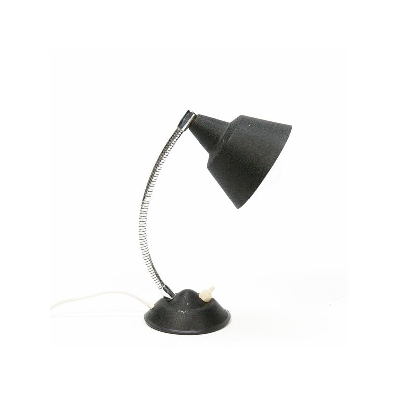 Vintage table / bedside lamp from the sixties. The lamp has a flexible arm, which the height can be adjusted. The condition is fairly good, slight traces of use are visible, see detailed pictures. The size is 22 cm high and 10 cm in diameter (cap).