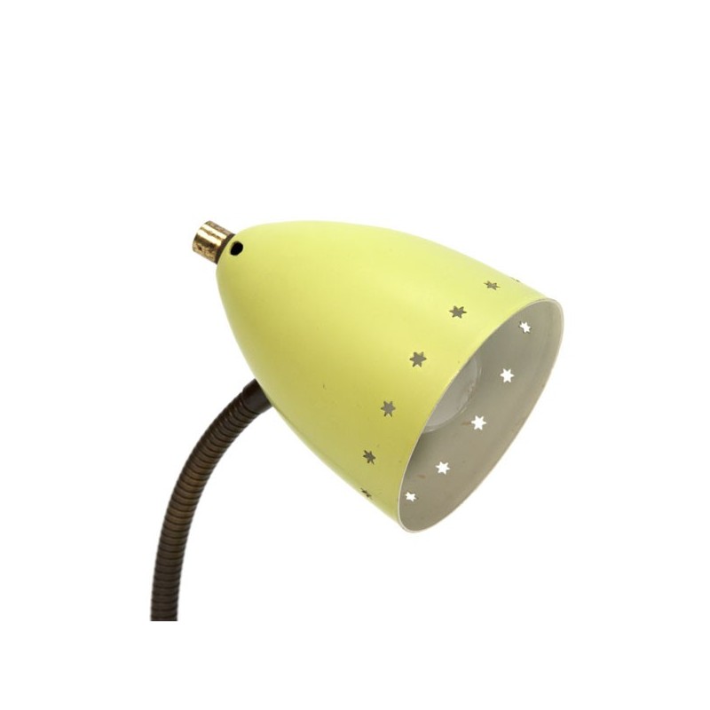 Vintage table/ desk lamp from the fifties. The yellow shade is perforated with stars. The condition is fairly good, the shade hase a small dent, the price is adjusted accordingly. The dimension is 23 cm high and the cap is 9 cm in diameter and 12 cm long.