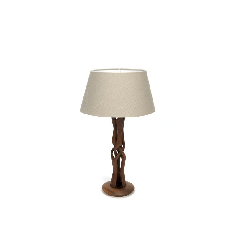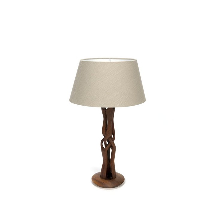 Vintage table lamp with a specially designed teakwood base. The lampshade is gray (new). The condition is good considering the age, see the detail photos. The dimension is 60 cm in height including the lampshade.