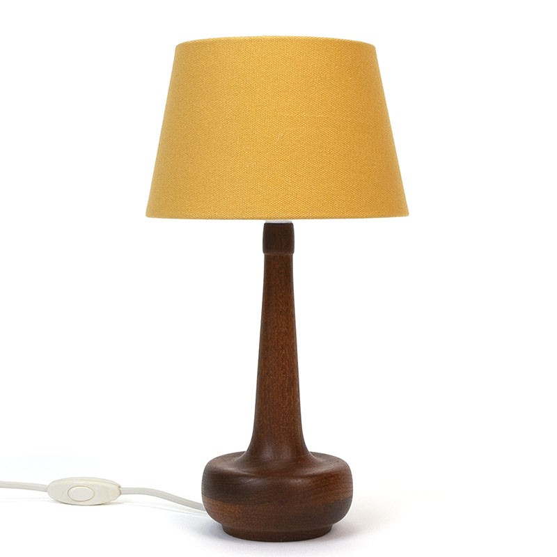 Danish teak vintage table lamp from the fifties / sixties. Beautiful model with high neck and ocher yellow cap (cap is new). The condition is good, wiring has been checked, see details. The dimensions are 35 cm high and 20 cm in diameter.