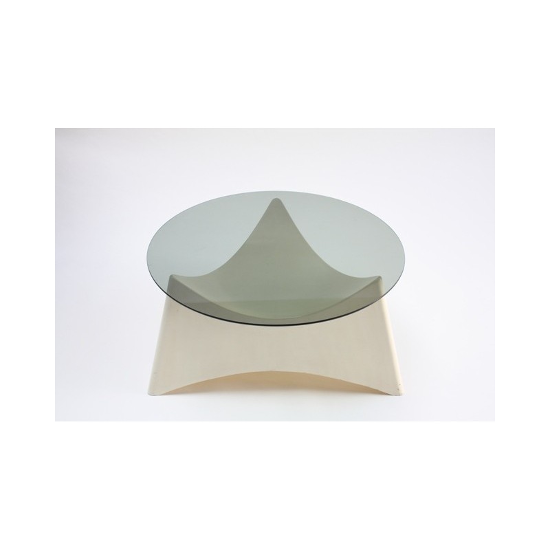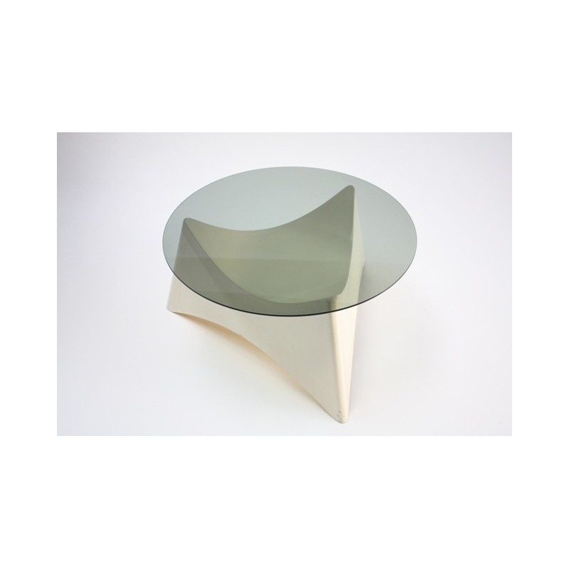 Vintage design coffee table from the late 1960's early 1970's. The table has a plastic base and a smokedglass top. On the bottom the table is marked: SB precisie meubelen Woerden ( Holland). The condition is good, see also the detailed pictures. The dimension is 80 cm in diameter and 41,5 cm in height.