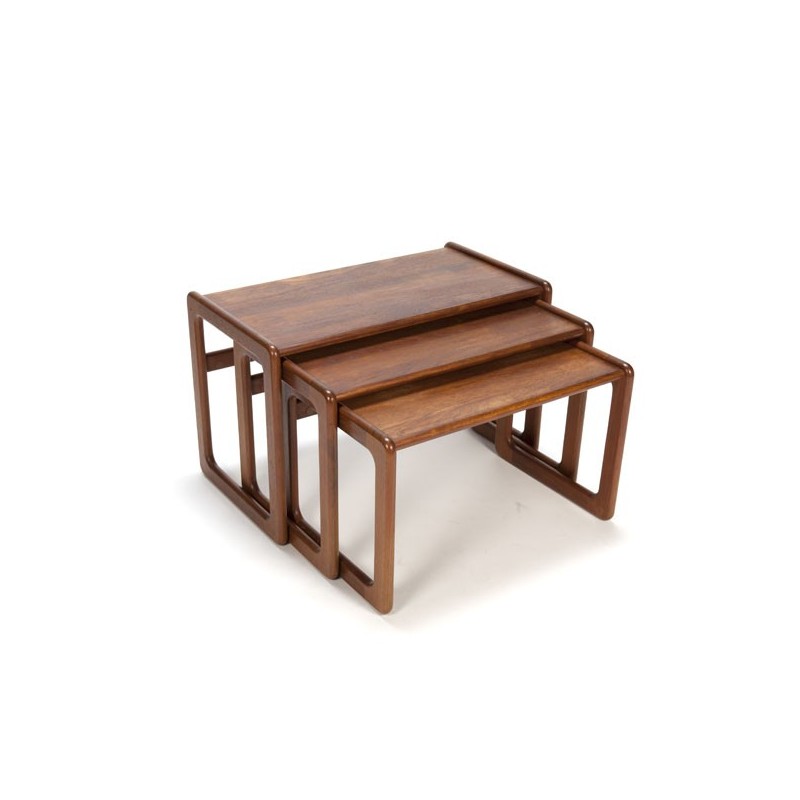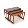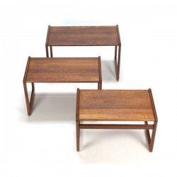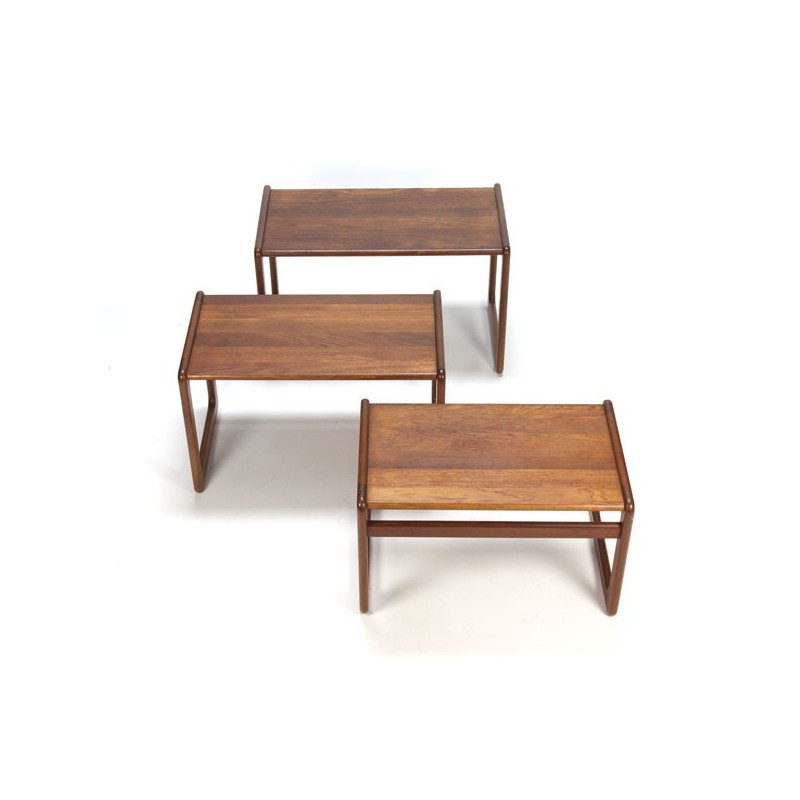 Set of 3 vintage nest tables made in teak. The tables are nicely aligned. The condition is good considering the age, very slight wear on the blade visibly see the detail photos. The dimension is 70 cm L / 38 cm W / H 44 cm (largest table), then the length is 64.5 cm and 59.5 cm.