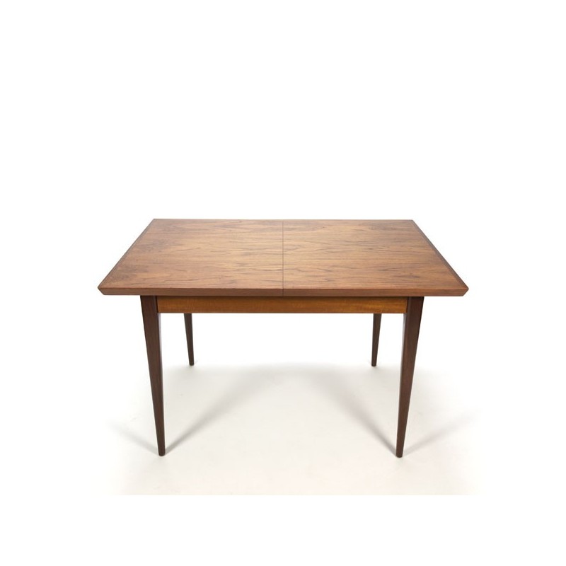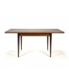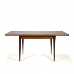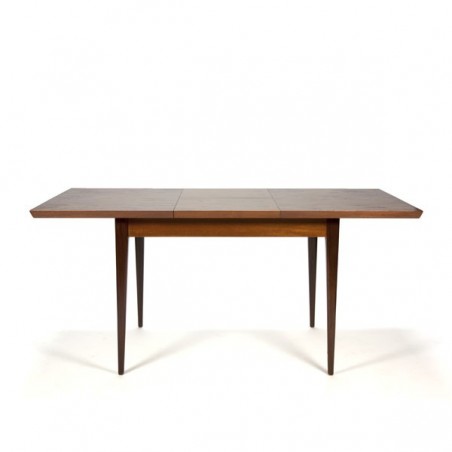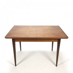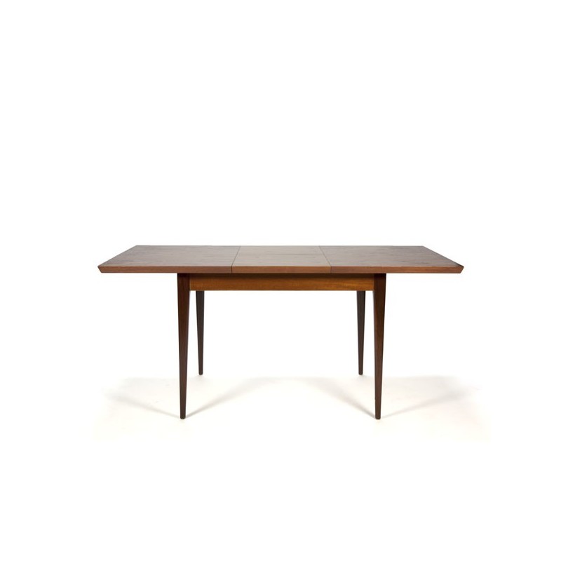 Vintage dining table from the sixties, made in teak. The table has an additional intermediate leaf that is sunk in the middle of the table. The condition is fairly good considering the age, light traces of use, see the detail photos. The dimension is 121-166 cm L / 79,5 cm W/ 75 cm H.