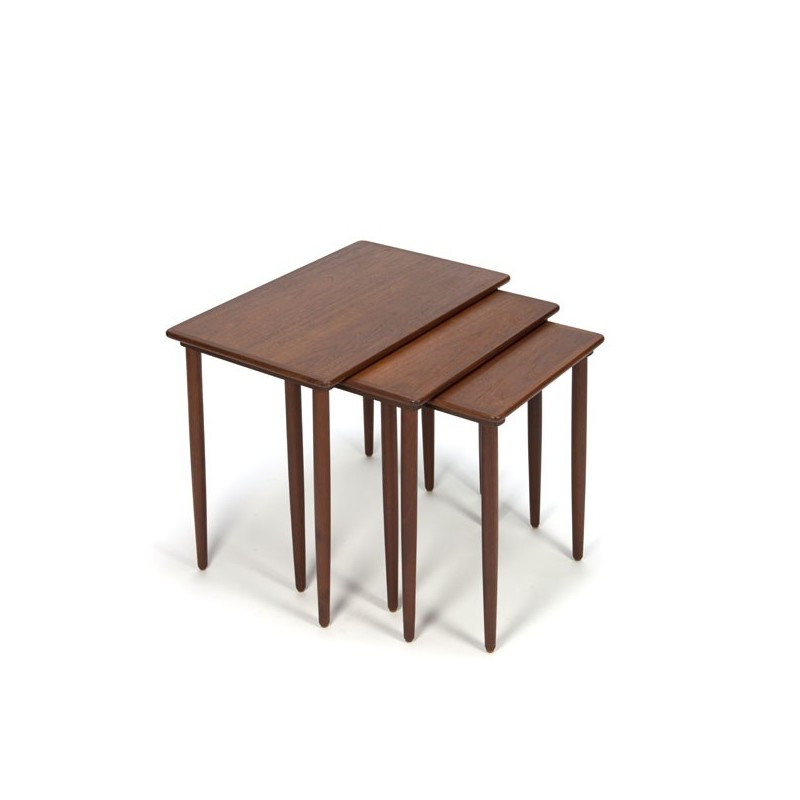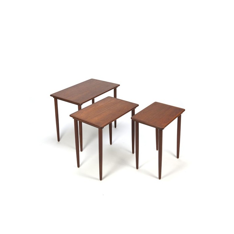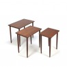 Vintage set of 3 side tables made of teak, from the mid-Sixties Denmark. The tables fall nicely among themselves. The condition is good, see the detail photos. The dimension is of the largest table is 58.5 cm L / 38 cm W/ 48,5 cm H, the consecutive height is 47 cm and 45.5 cm.