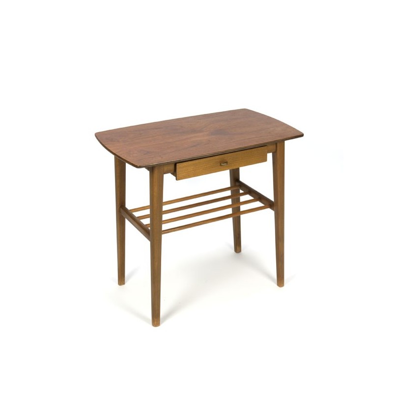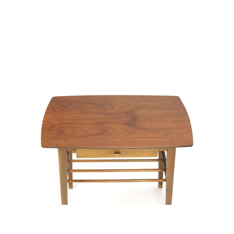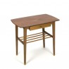 Vintage side table from the sixties, Denmark. The table has a teak top with a small drawer and space for bottles or magazines on the wooden bars. The condition is good considering the age, see the detail photos. The dimension is 59.5 cm L / D 36,5 cm / 55 cm H.