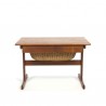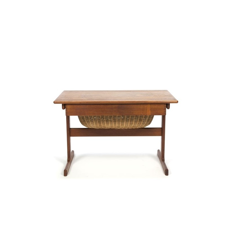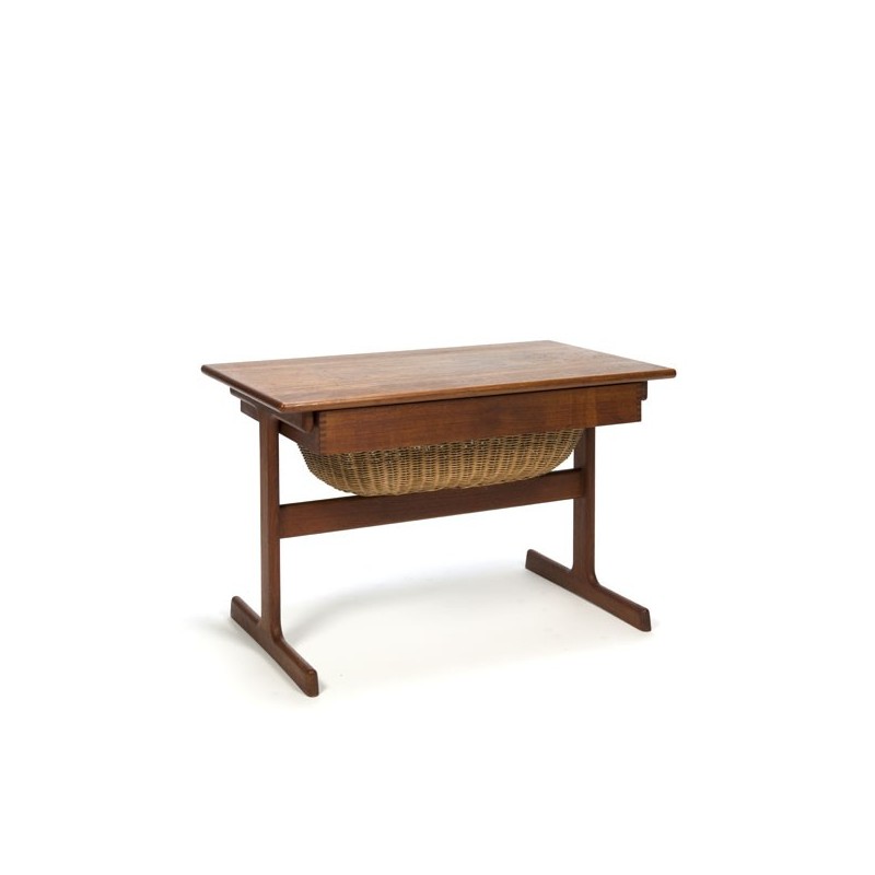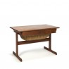Danish design side table with ample drawer of woven wicker. The table is designed as sewing / knitting table, but for many purposes. On the teak top are some scratches visible, see the detail photos, condition is also good, also the wicker is undamaged. The dimensions are 72 cm L / D 43 cm / 46 cm H.