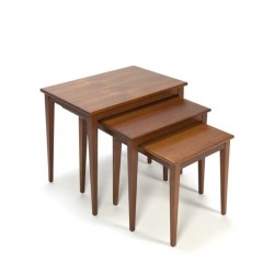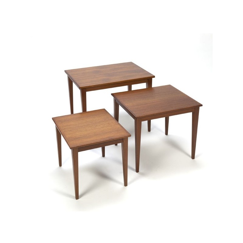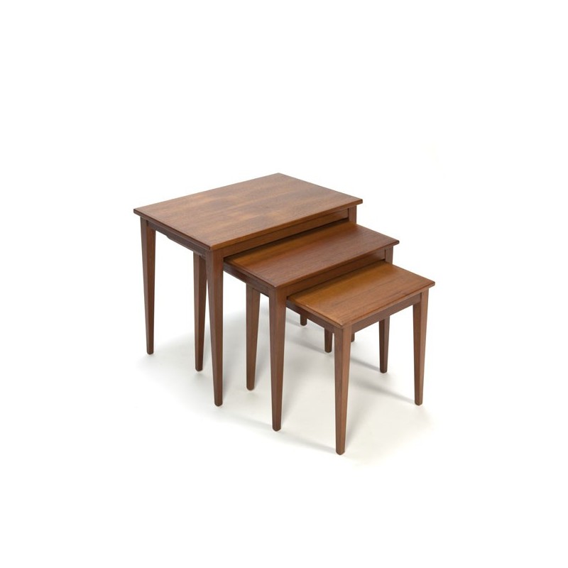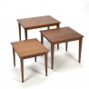 Danish vintage set of three side tables, made in teak. When the tables are slid into each other the feet of the two smallest tables hang loose from the ground. The condition is good considering the age, the smallest table has a corner that has been restored, see the detailed pictures. The dimensions are of the largest table 59 cm L / D 40.5 cm / 50.5 cm H, the successive height is 44 cm and 38 cm.