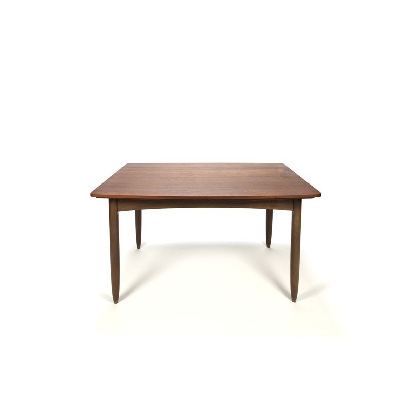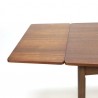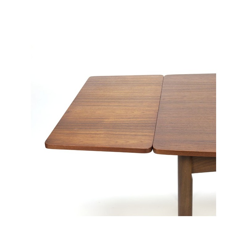 Vintage design table from the sixties, with extendable sheets. The table is made of teak. The condition is good considering the age, see the detail photos. The dimensions are 129-206 cm L / 88,5 cm W / 75 cm H.