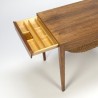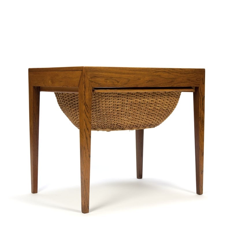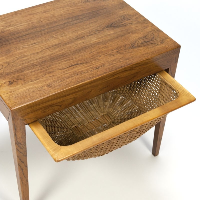 Danish vintage design side table (officially a sewing table). Designed by Severin Hansen jr. In 1955-1958 and made by Haslev Møbler in Denmark. Very nice piece made from a light type of rosewood, with a drawer with pincushion and a wicker basket for wool. The condition is good considering the age, almost no signs of use, see the details. The dimensions are 58.5 cm long, 43.5 cm wide and 52 cm high.