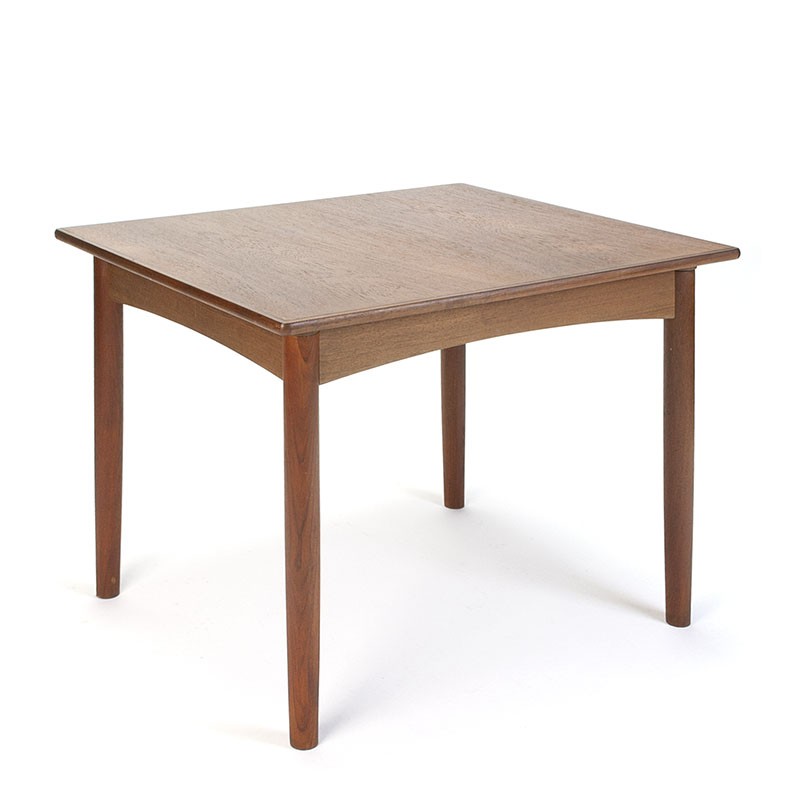 Small model dining table from Denmark. The vintage dining table is from the fifties and is made of teak. The condition is reasonably good, light traces of use, see details. The dimensions are 85.5 cm wide, 70.5 cm deep and 71 cm high.