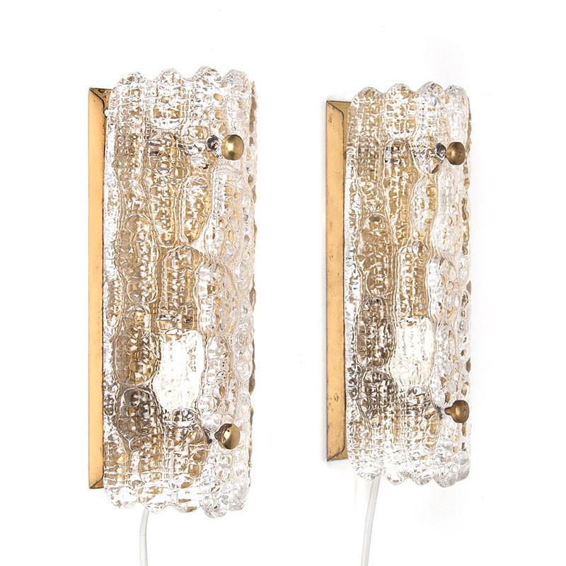 Design wall lamps, set of 2, designed by Carl Fagerlund for the Swedish glass factory Orrefors in the period 1950-1960. The vintage lamps were released by Lyfa. Beautiful luxury lamps made of glass with a brass wall part. The condition is good, no damage to the glass, see also the detailed photos. The dimensions are 28 cm high, 12 cm wide and 8 cm deep. Wiring replaced.
