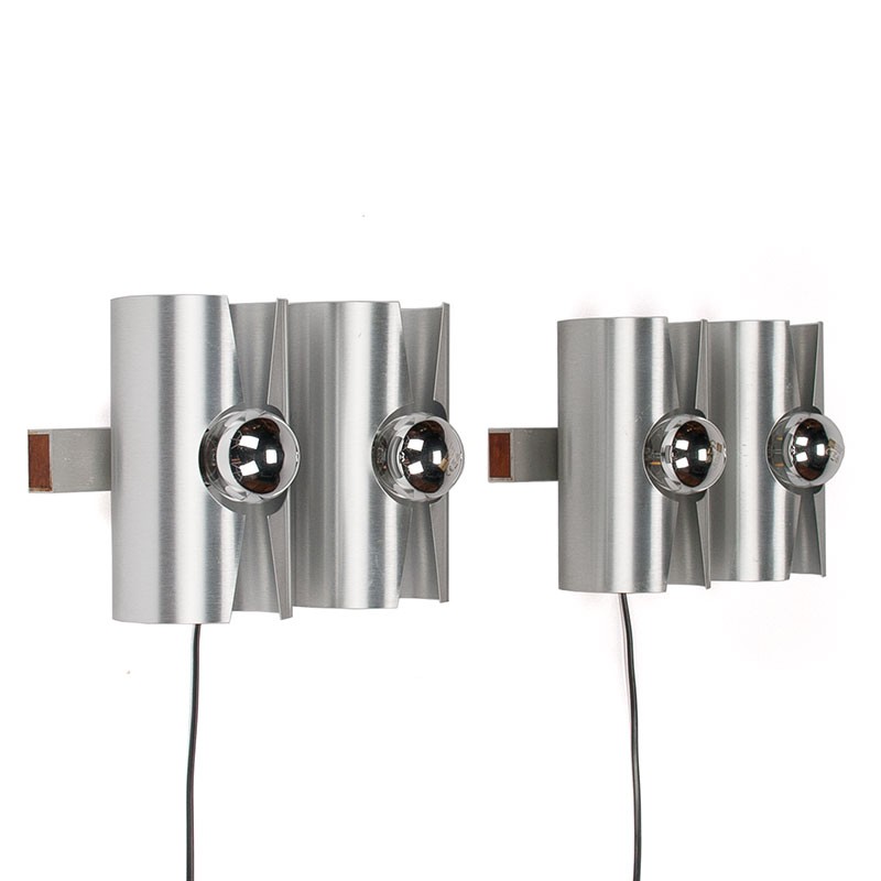 Set of aluminum wall lamps. The vintage wall lamps both have two light sources. They are beautifully designed in aluminum with a small teak detail on the wall section. The condition is good, with only minor signs of wear; see details. The dimensions are 30 cm wide, 13 cm deep, and 20 cm high.