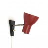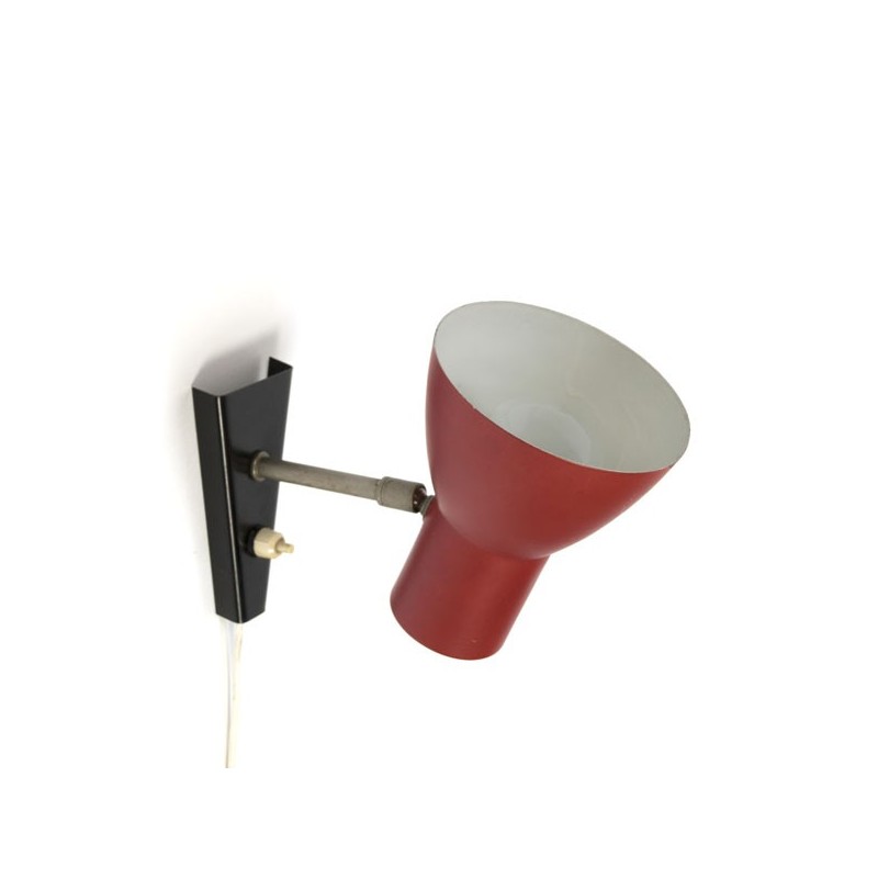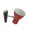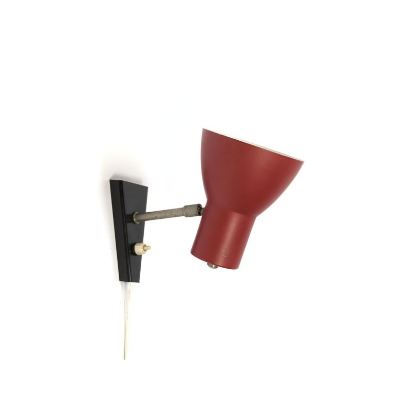 Vintage wall lamp from the sixties with a red-colored cap. The condition is good considering the age, see the detail photos. The size is 20 cm deep, the cap has a diameter of 11 cm.