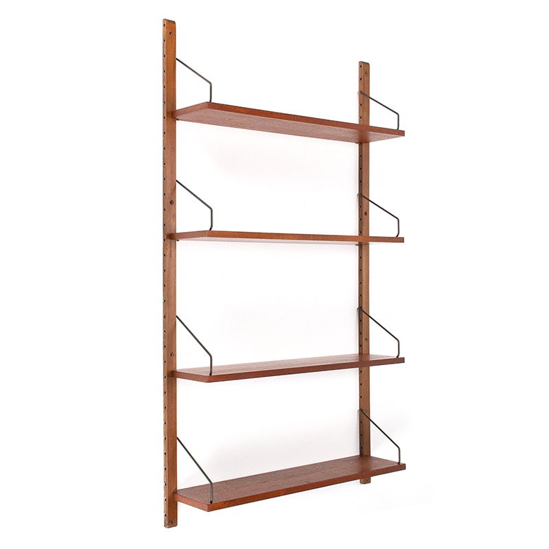 Vintage design wall system designed by Poul Cadovius in 1948, Denmark. The Royal System was released by Cado Denmark. This system consists of 4 shelves and 2 wall parts. The condition is reasonably good considering the age, see details. The dimensions are 4 times 80 cm wide and 20 cm deep, the wall parts are 150 cm high.