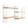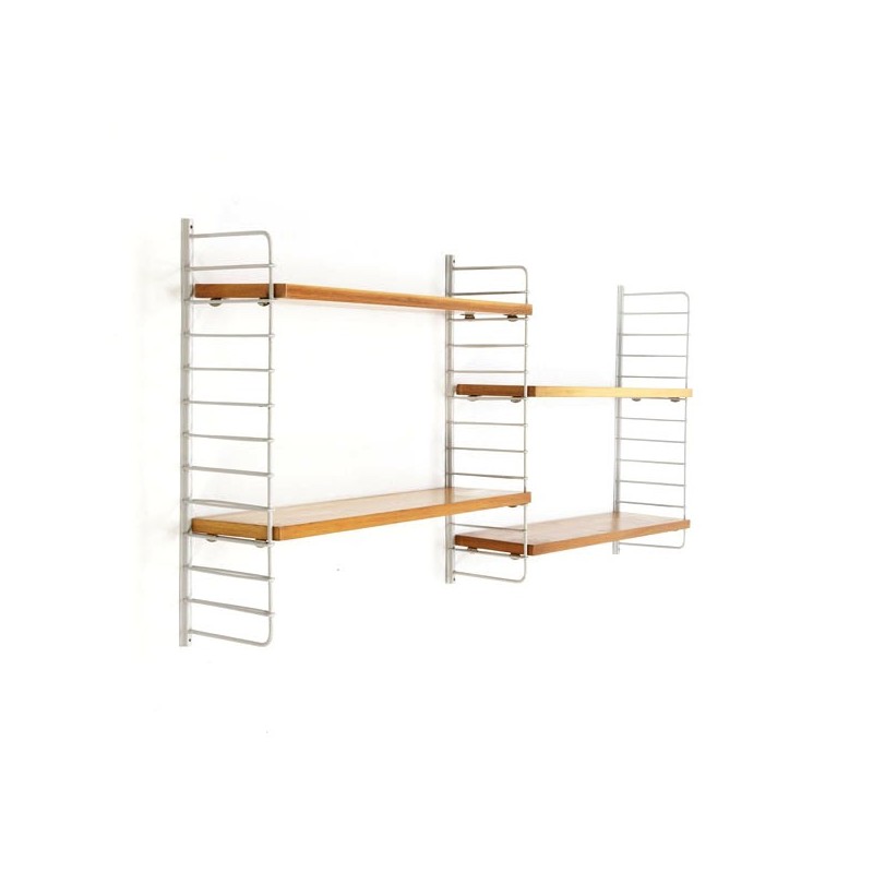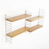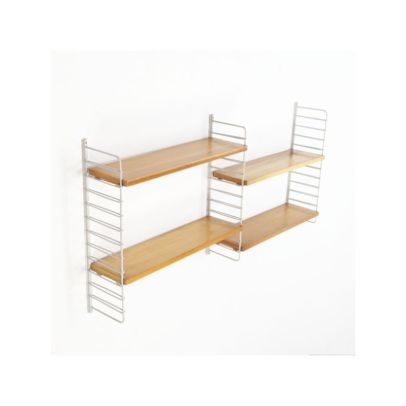 Vintage wall system from the late sixties made with wooden shelves. The system consists of four shelves (62.5 cm long and 17 cm wide) and 3 gray wall mounting parts (60 cm high). The condition is fairly good, see the detail photos. The size is 125 cm long.