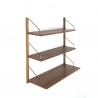 Vintage Danish wall system and / or book shelves with 3 shelves in two different sizes. The teak shelves suspended from brass-colored brackets. The condition is fairly good, the shelves are in good condition with very light wear, one of the wall parts has multiple screw holes, see detailed pictures. The dimensions are 89 cm high and 92.5 cm wide. The shelves are: 1 shelf 89.5 cm wide by 30 cm deep and 2 shelves 89.5 cm wide and 22 cm deep.