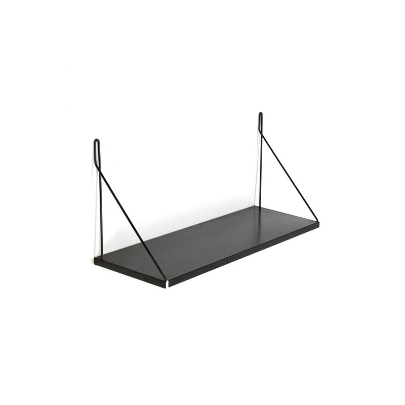 Vintage metal bookshelf from the fifties / sixties. Black shelf hangs on two distinct black wall brackets. The condition is fairly good, visible on a single spot is some oxidation, see the detail photos. The dimensions are 63.2 cm L / D 21 cm / 27 cm H.